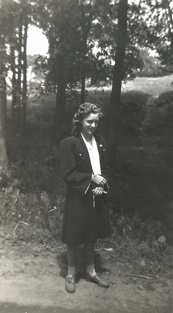 1941 – First picture Dad took of Mom. Dad’s sister gave him a camera for graduation so the first thing he did was to coax Mom into letting him take her picture on the way home from school in the Pittsville park.